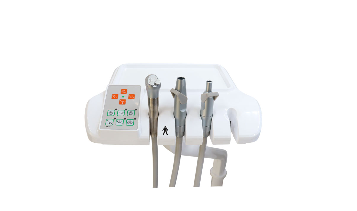 Bandeja de instrumentos, equipada con panel de control amplio de 12 teclas, que permite un acceso rápido y ordenado a las funciones clínicas. Incorpora soporte para piezas de mano con giro de 90°, facilitando su manipulación durante el tratamiento. Cuenta con panel tipo Touch Pad con sistema inteligente y base de aluminio fundido, que garantiza estabilidad, resistencia y durabilidad en el uso diario.